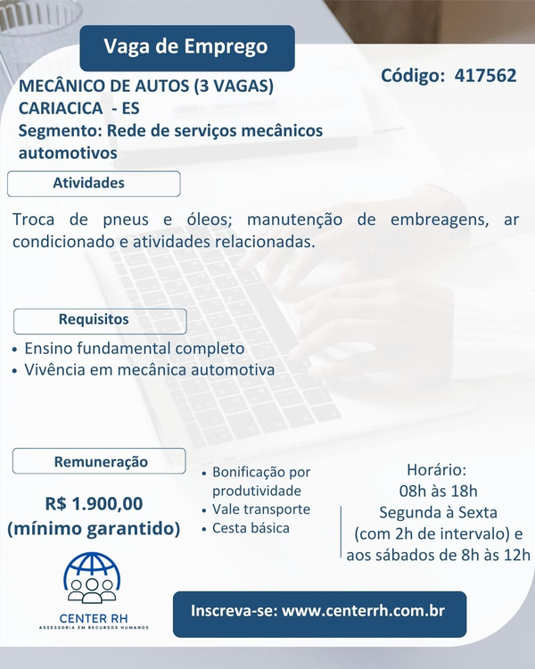 REDE DE SERVIÇOS MECÂNICOS AUTOMOTIVOS CONTRATA 3 PROFISSIONAIS.